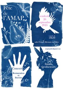 Retenez la date, fête de l’AMAP le vendredi 26 septembre ! Une distribution à laquelle on peut rester boire un verre, écouter de la musique, discuter avec les producteurs et productrices, manger, bref créer un peu de convivialité. Ça ne peut pas faire de mal par les temps qui courent. On compte donc sur votre présence voire vos coups de mains !