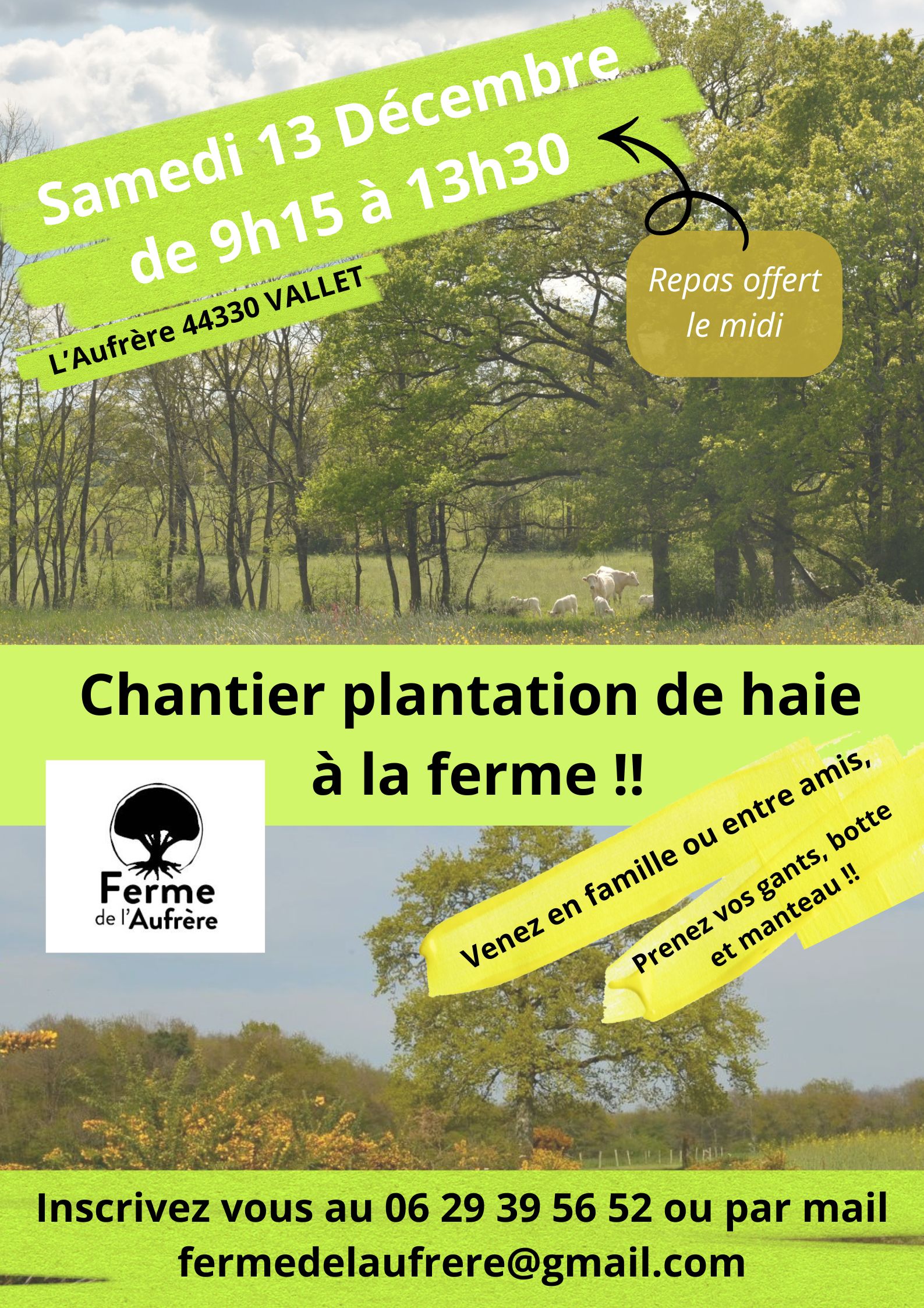 La semaine de la haie du Collectif Environnement Sèvre et Loire vient de se terminer mais les plantations de haies continuent ! Cette fois-ci c’est l’association Terres en Vie qui fait appel à bénévoles pour un chantier participatif le samedi 13 décembre à la ferme de l’Aufrère :